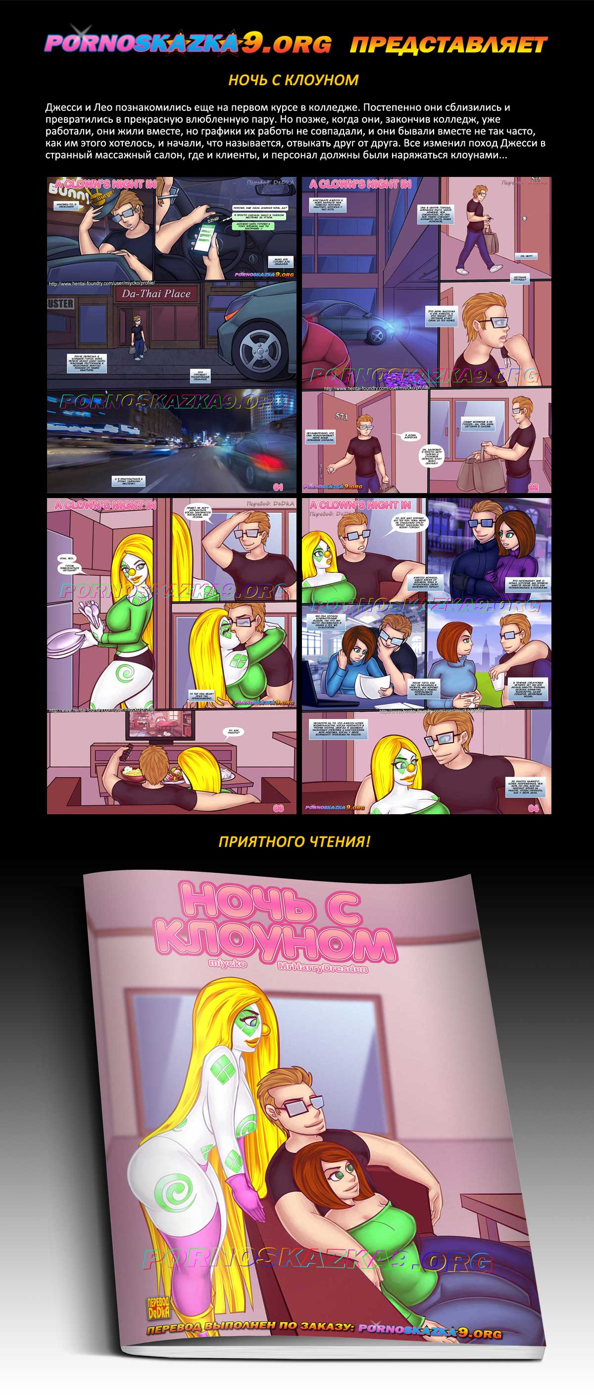 Порно комикс Ночь с клоуном. Джесси и Лео познакомились еще на первом курсе в колледже. Постепенно они сблизились и превратились в прекрасную влюбленную пару. Но позже, когда они, закончив колледж, уже работали, они жили вместе, но графики их работы не совпадали, и они бывали вместе не так часто, как им этого хотелось, и начали, что называется, отвыкать друг от друга. Все изменил поход Джесси в странный массажный салон, где и клиенты, и персонал должны были наряжаться клоунами…